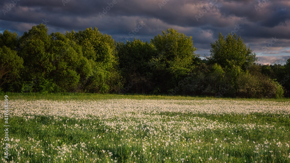 Amazing spring flowering valley, scenic landscape with wild growing narcissus flowers, green trees, and dramatic cloudy sky. Daffodil valley, nature reserve near Khust, Transcarpathia, Ukraine