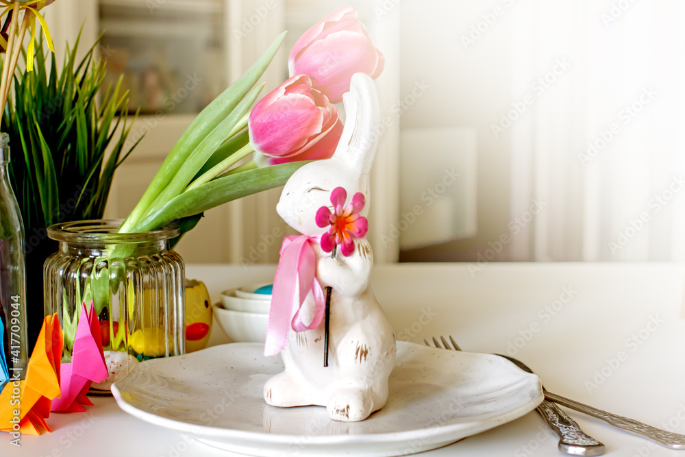 Easter table setting with a figurine of an Easter bunny, tulips, Easter bouquet