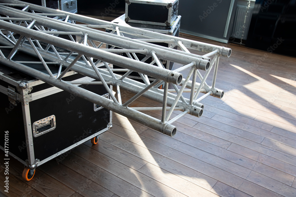 Stack of metal trusses for mounting the stage. A metal truss lies on a box. Сonstruction stage.