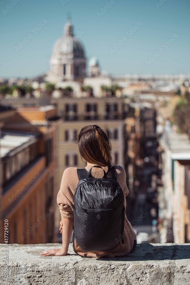 A girl enjoying the view of Rome sitting on a low wall giving the back to the camera