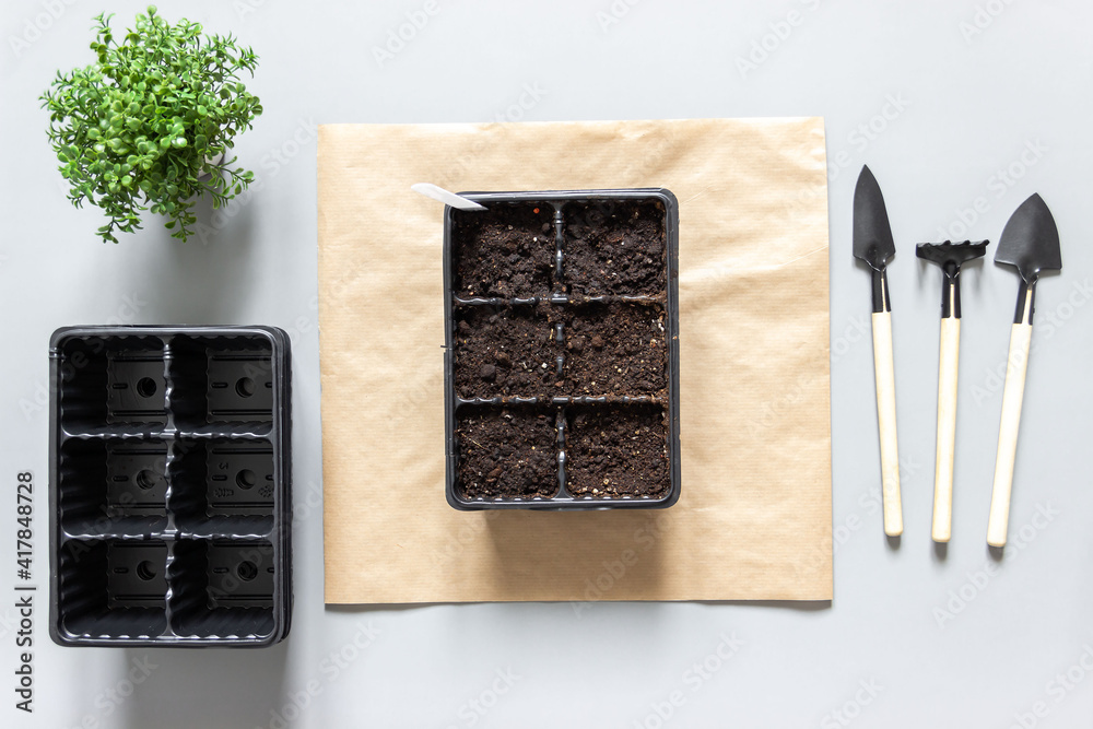 Seedling container filled with earth, small shovels and a rake for plant care. Gardening, the spring planting at home.