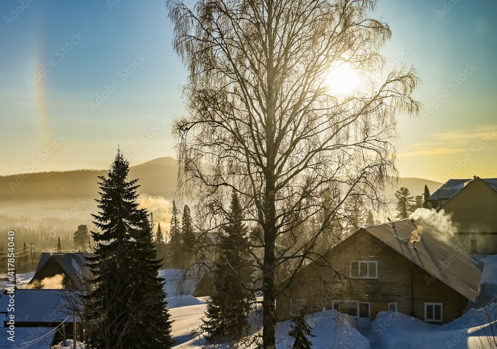 dawn in winter in the village