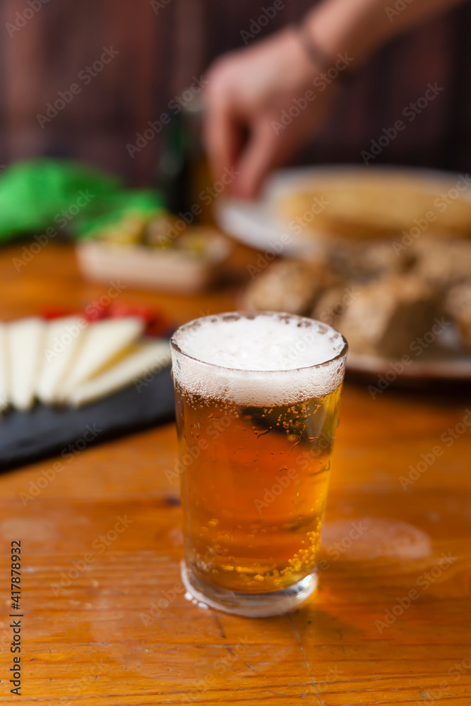 Delicious beer glass freshly poored with foam on a tapas bar background.
