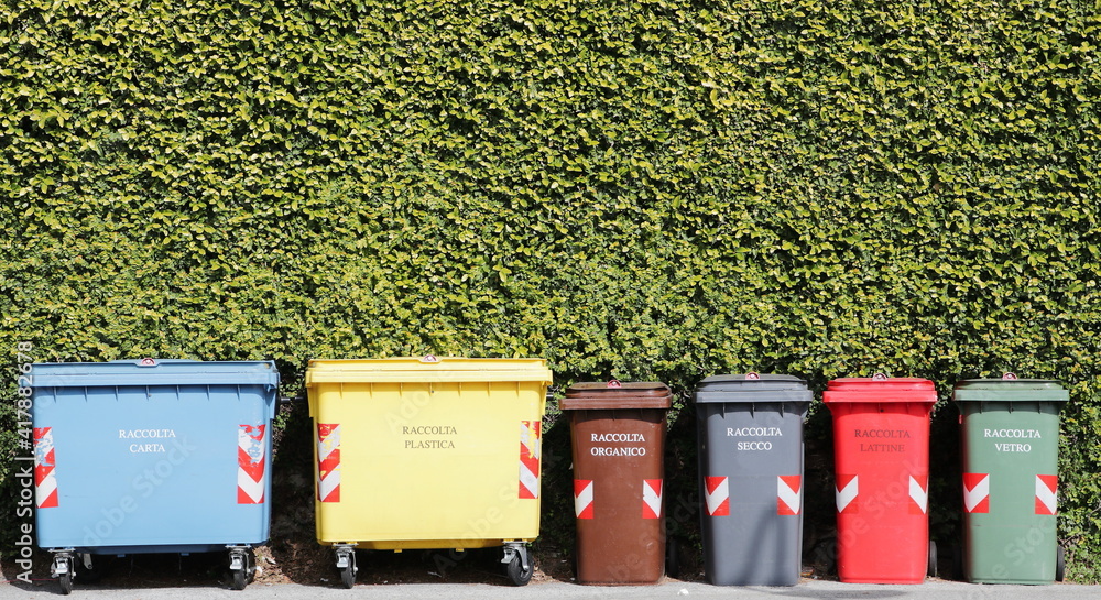 Group of coloured recycling bins on the street for paper plastic organic dry can and glass in Italy
