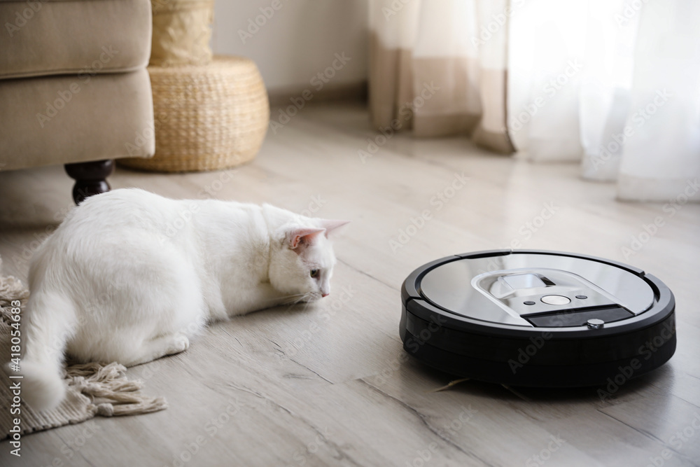 Modern robotic vacuum cleaner and cute cat on floor indoors