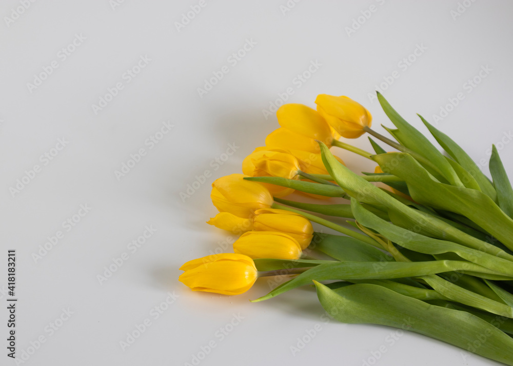 Yellow tulips on white background, free space for text, copy space, selective focus