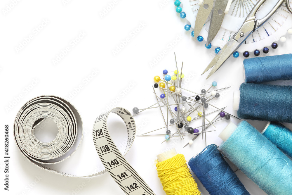Sewing accessories template. Scissors, tape measure, spool of thread and needle on a white background.