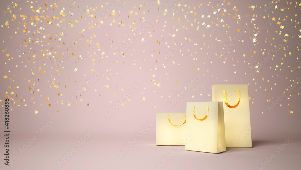Glowing shopping bags on pink background and gold stars on pink background.