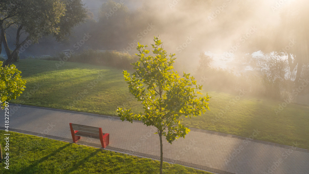 Dawn in the park. Fresh morning in the recreational area of Bucha