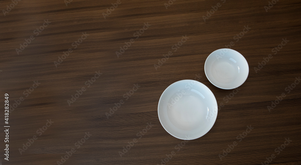due piatti bianchi su tavolo da pranzo color castagna chiaro