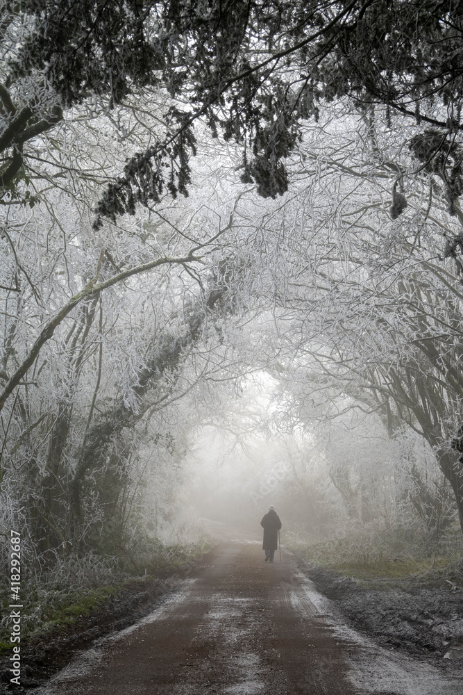 Country lane leading through trees covered in rime ice on winter morning, Highclere, Hampshire, England, United Kingdom, Europe