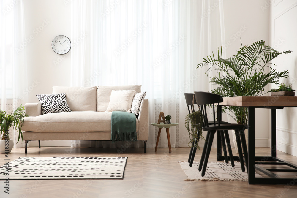 Stylish living room interior with beautiful house plants