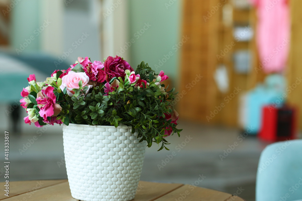 modern bedroom closeup fragment with flowers in vase, sofa and pillows on background