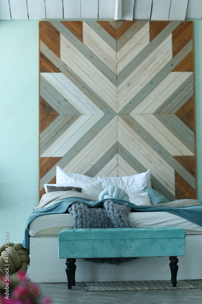 bedroom corner blue bad, knitted rag, pillows and bench close up photo