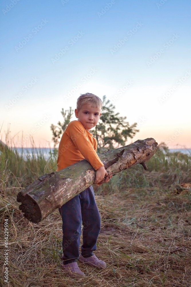 Cute 5-6 years old girl tourist in a coat and flowers garland with red and white suitcase hitchhiking along a road and holding cardboard, outdoor, ready for summer, vacation and travelling concept