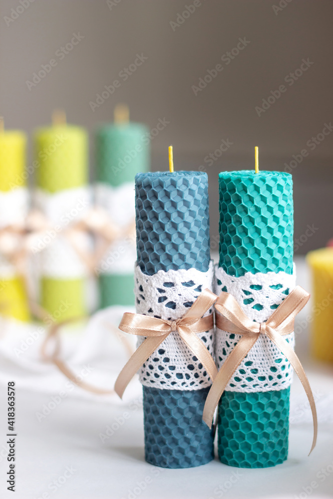 Close up of two natural decorative beewax candles with lace ribbons and a honey aroma for interior. A delicate color palette. Handmade