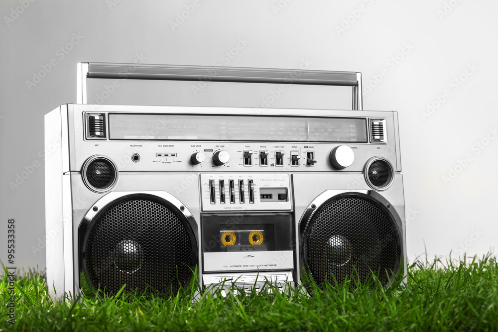 Professional microphone with waveform and headphones on a pink background banner. Podcast or recording studio background