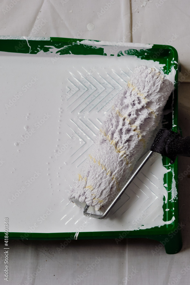 White paint roller collecting paint in a paint container.