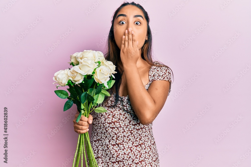 Young latin woman holding flowers covering mouth with hand, shocked and afraid for mistake. surprised expression