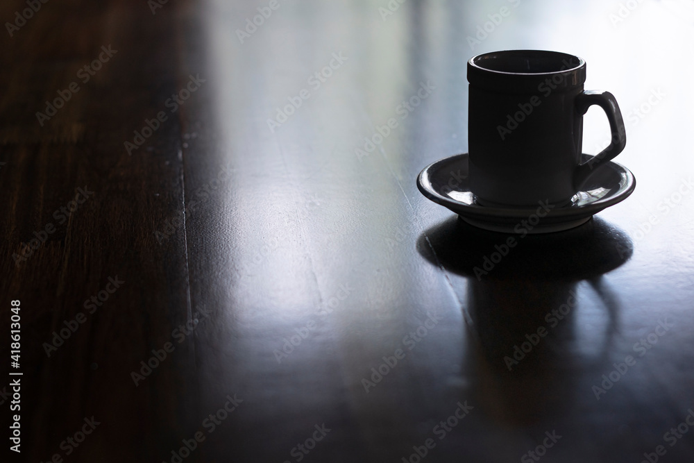 Cup of coffee with saucer on wood table. Figure in shadows. Reflection on table