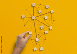 Business strategy, business management or business success concept. Hand is arranging wooden blocks in low polygon light bulb shape network on yellow background.