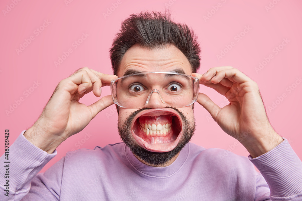 Startled handsome man stares surprisingly through transparent spectacles clenches teeth has widely opened mouth hears great news stands alarmed being super shocked stands indoor. Emotions concept