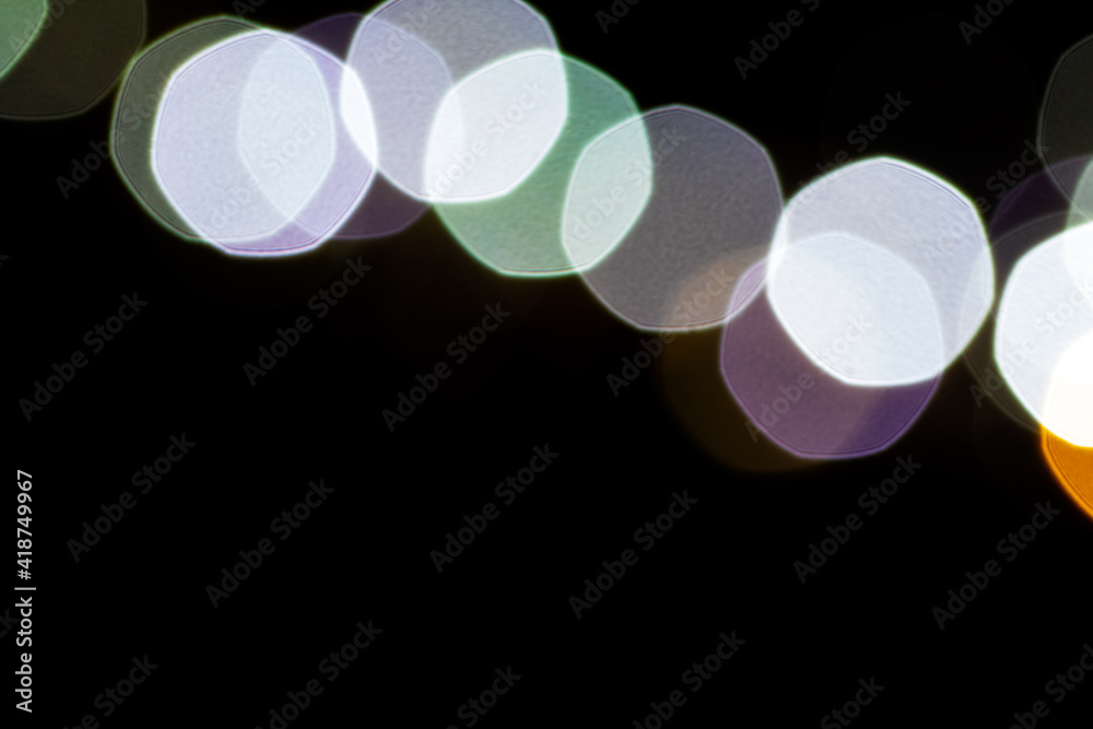 Abstract close up bokeh background with black backdrop. Free copyspace on left for text or design