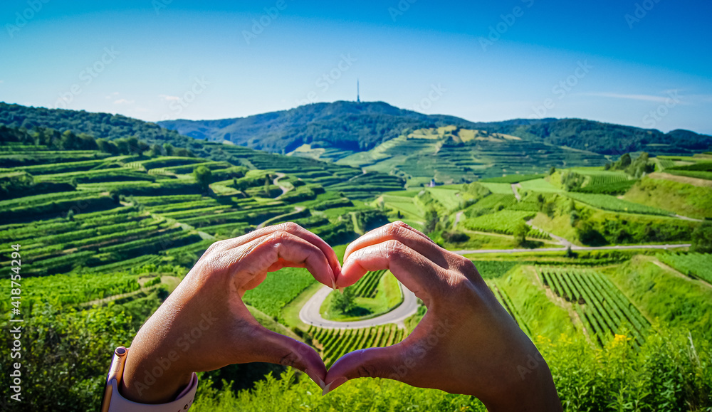 Close-up of woman's hands forming a heart in the golden evening sun. If you look through you can see the beautiful vineyard terraces with a mountain pass road at Kaiserstuhl, Germany.