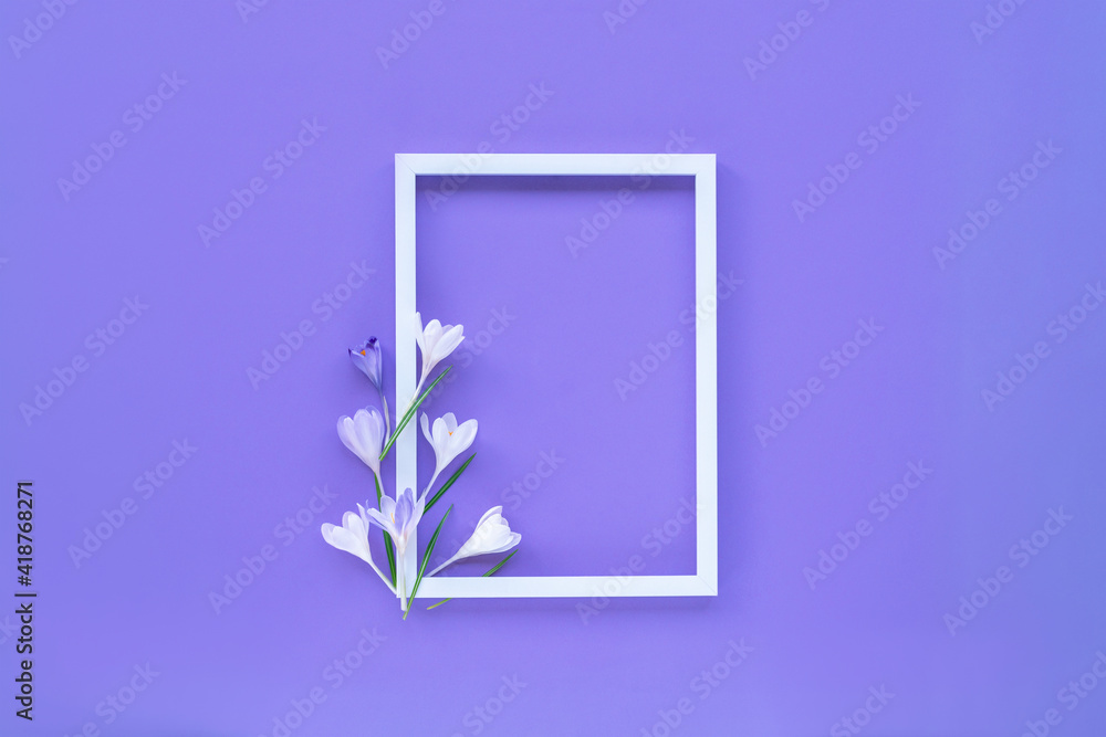 Picture frame and crocuses on purple background. Top view, flat lay, copy space. Spring concept