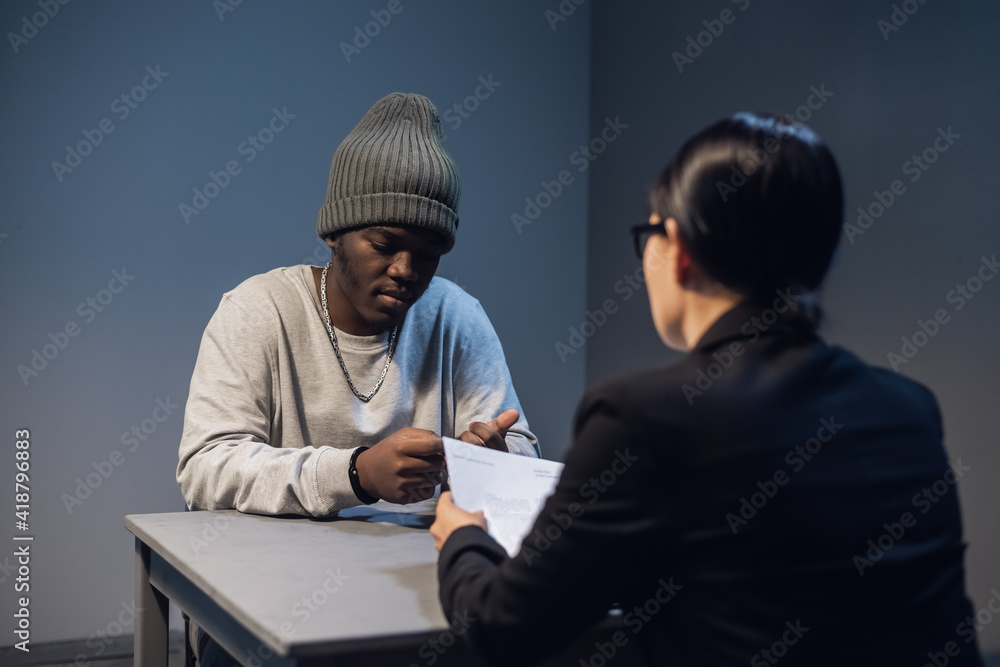 A lawyer girl with glasses and a young black guy communicate in the interrogation room about the grounds for his detention.