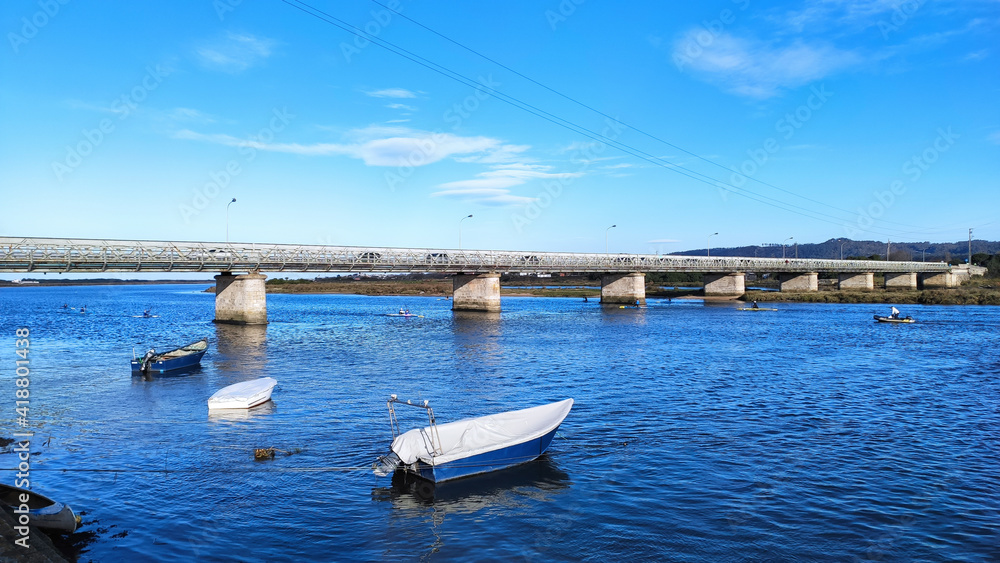 Fao, Esposende, Portugal - January 10, 2021: The Fao metallic bridge, known as D. Luís Filipe Bridge. Canoeists on the Cavado River.