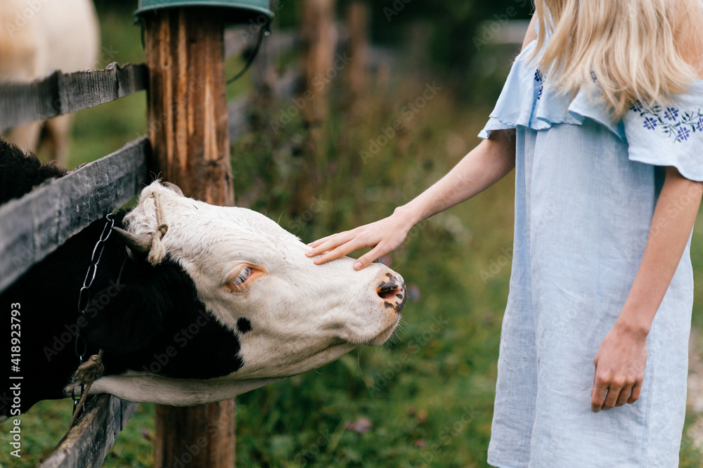 ?ropped shot of elegant girl in blue romantic dress touching the cow in the countryside