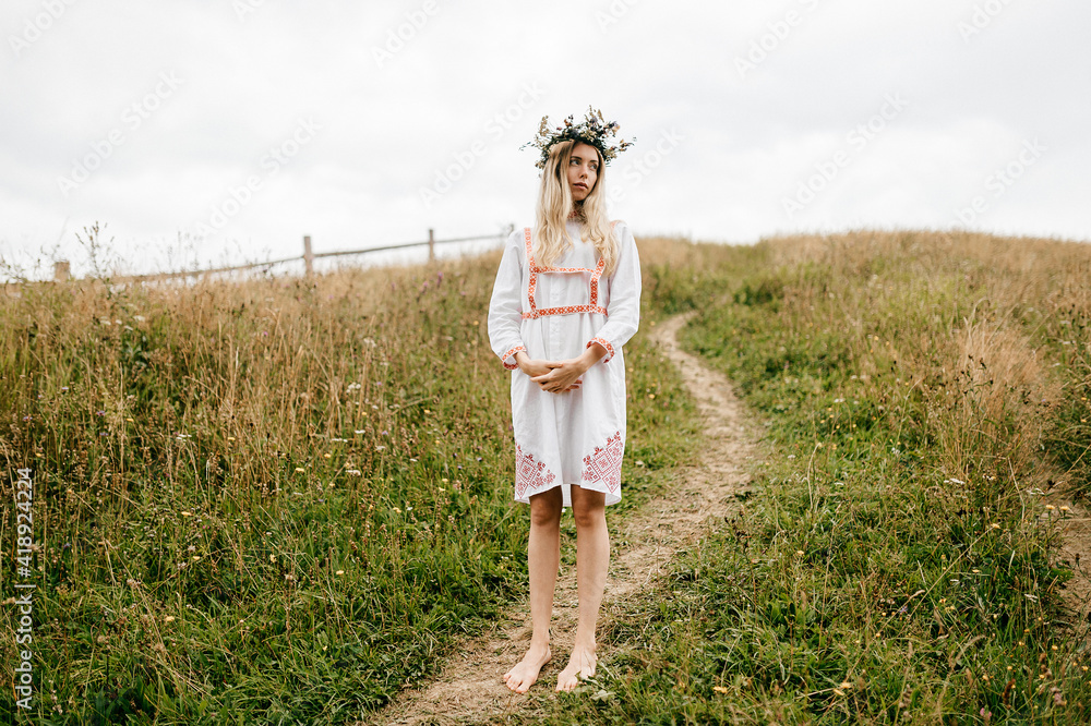 Young attractive barefoot blonde girl in white dress with ornament and flower wreath on the head posing in the field
