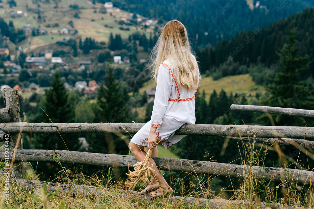 Young attractive blonde girl in white dress with ornament sitting on wooden fence with spikelets bouquet over picturesque countryside landscape