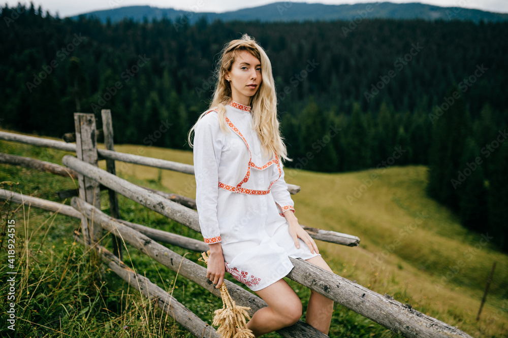 Young attractive blonde girl in white dress with ornament sitting on wooden fence with spikelets bouquet over picturesque countryside landscape