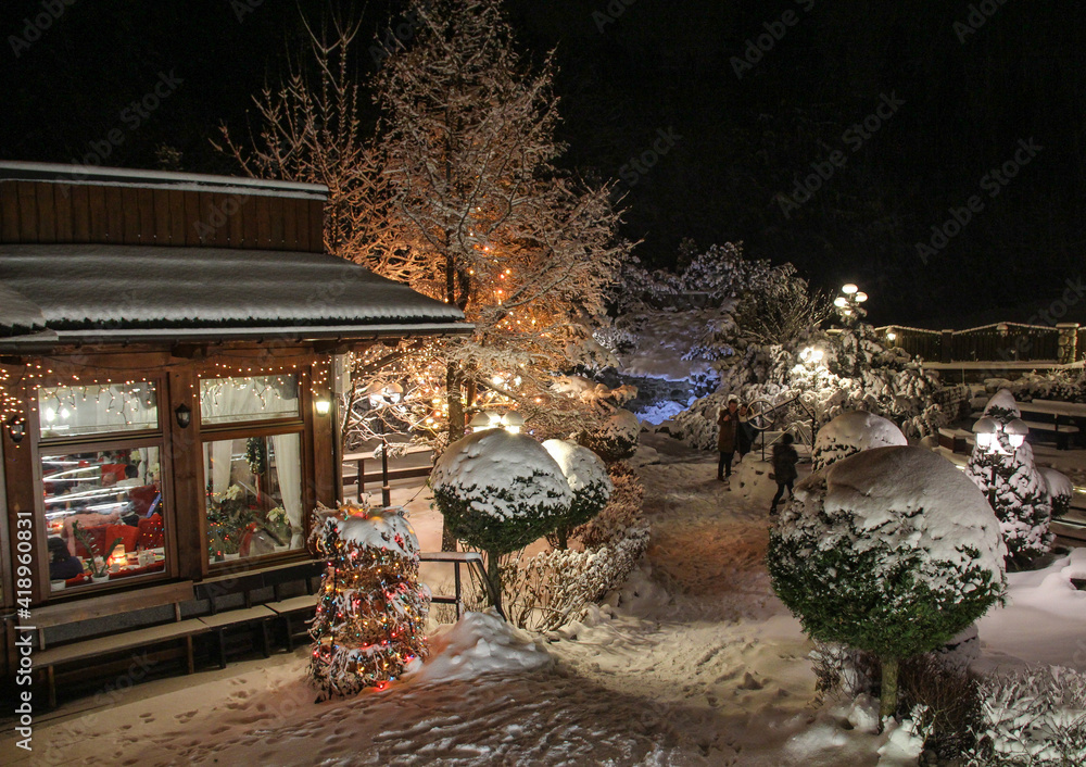 oświetlony ogród zimą w polskich górach ze śniegiem okrywającym roślinność i drzewa