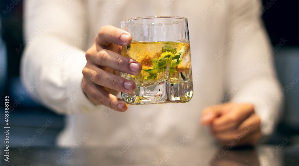 Barman serving mojito cocktail on glass. Concept for alcoholic drinks