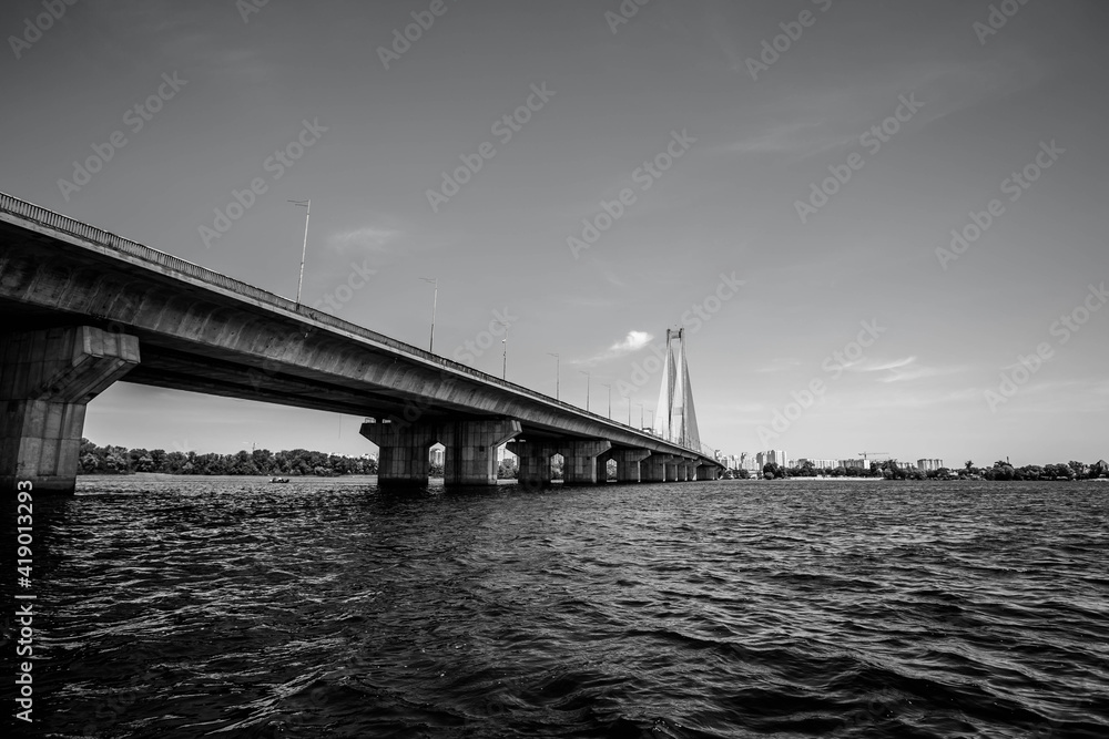 Antenna of the south bridge, the city of Kiev Ukraine. South bridge of the city of Kiev. Dnieper river, bridge over the river. Black and white photo