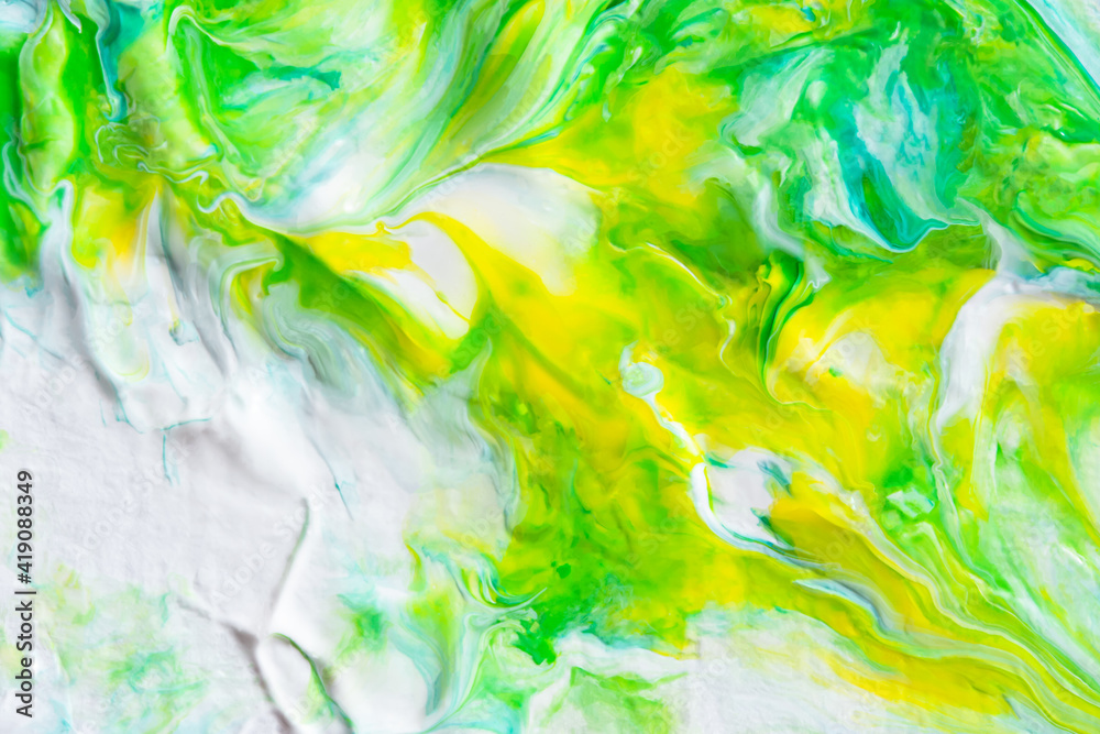 Abstract yellow-green acrylic background. Hand-drawn painting with liquid acrylic. Natural overflows. Spring art background. The technique of fluid art. Artistic author's style. Beautiful overflows
