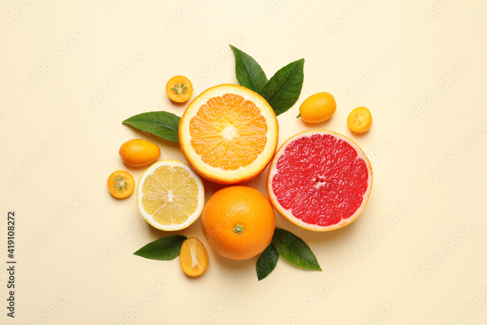 Fresh juicy citrus fruits with green leaves on beige background, flat lay