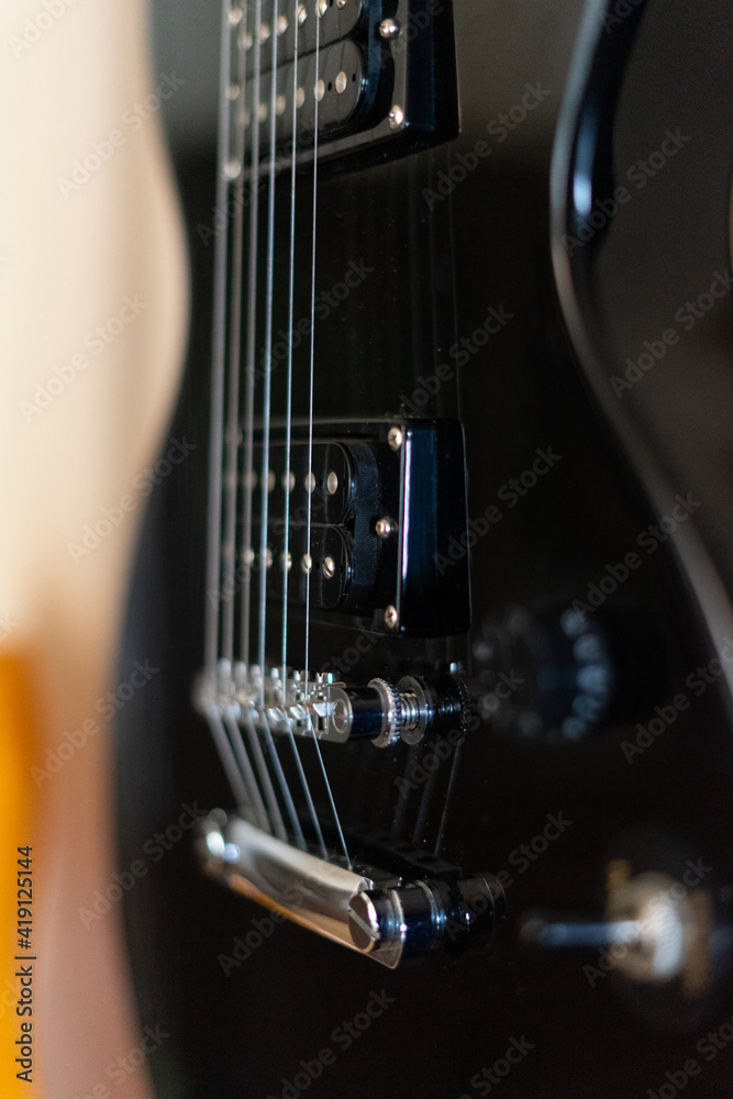 Detailaufnahme einer schwarze E-Gitarre, hängend an einer Wand