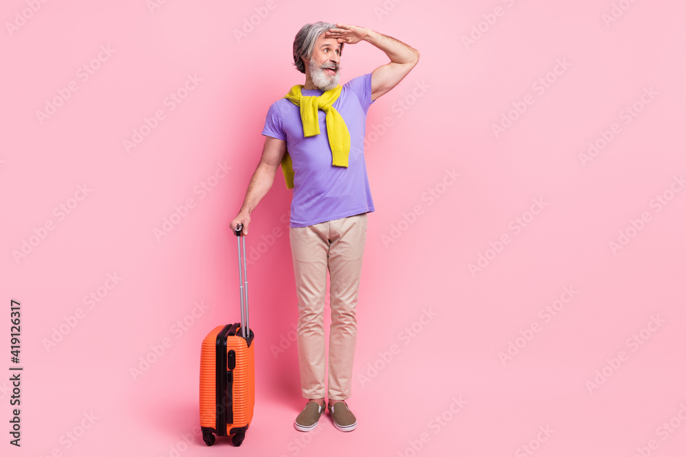 Photo of aged man happy smile baggage trip tourist vacation air fly look ahead sweater on shoulders isolated over pink color background