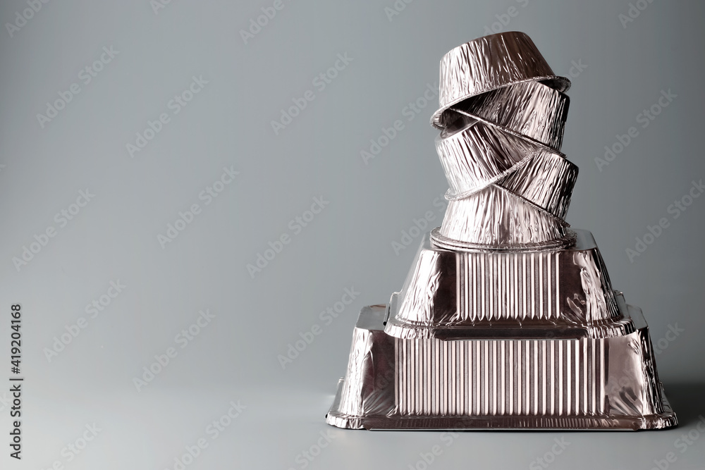 Aluminum foil containers for cooking on a light background. Foil environmentally friendly boxes of various shapes. Copy space. Balance.