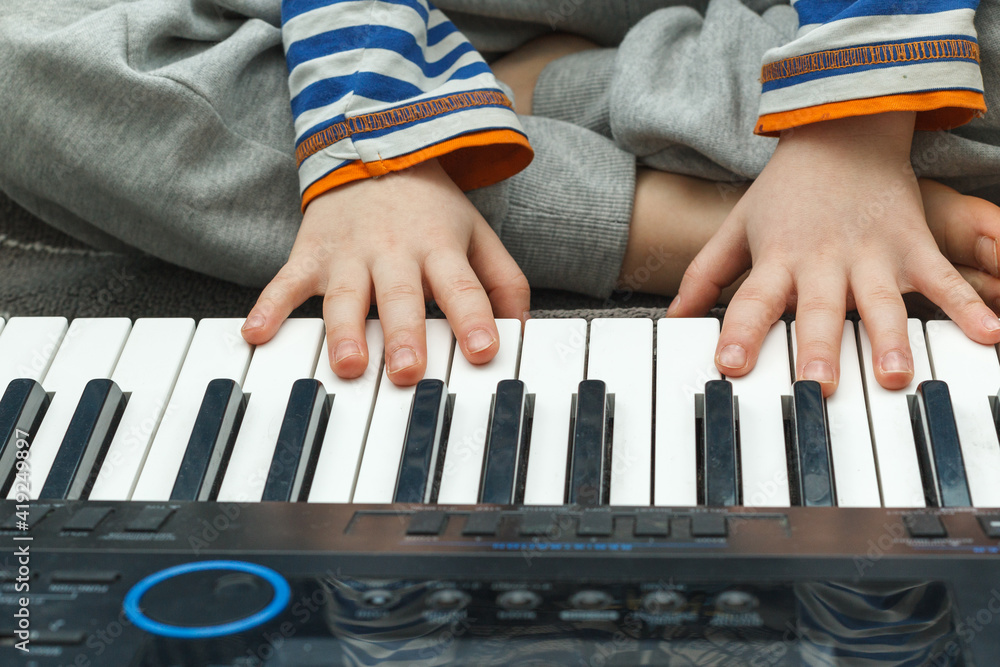 Children's hands on the keys. A child plays a synthesizer while sitting on the floor. Close-up, selective focus