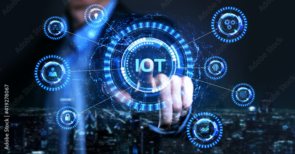 Internet of things - IOT concept. Businessman offer IOT products and solutions. Young businessman select the abstract chip with text IoT on the virtual display.