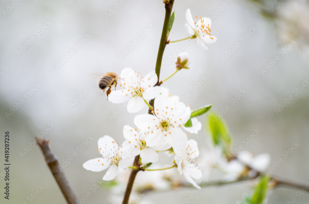 Frühlingsblumen an Bäumen mit Bienen