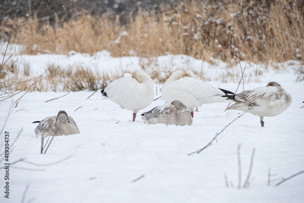 few snow geese resting on the snow-covered open field during the snow with their head resting on the shoulder