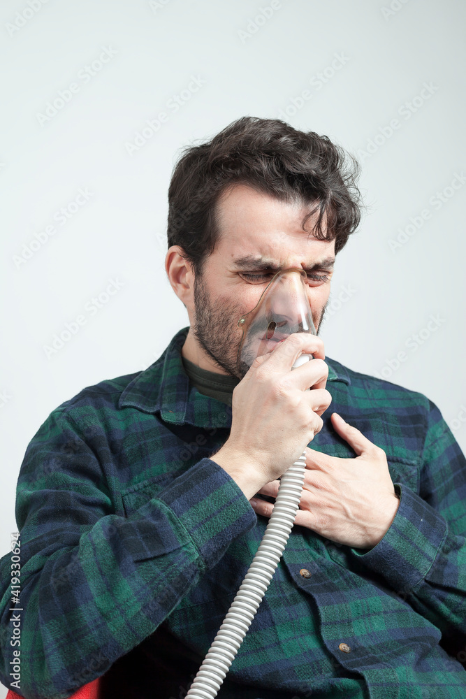 Vertical shot of adult sick man using an oxygen respirator on a white background. Respiratory problems and lung cancer concept.
