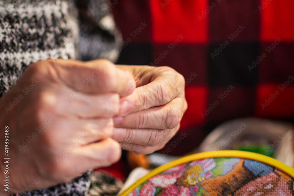 A woman embroiders with a cross. Wrinkled hands close up. An elderly woman holds a hoop and thread with a needle in her hands. Soft focus. The concept of hobby and manual labor. Pleasant home leisure.