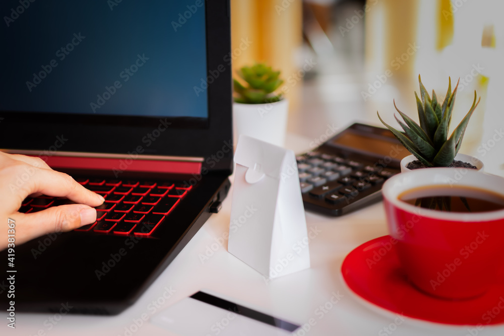 Online shopping concept. A young woman with a credit card in her hands at a table orders goods from an online store. Open laptop, red coffee mug, hands close-up. Home interior, blank map layout